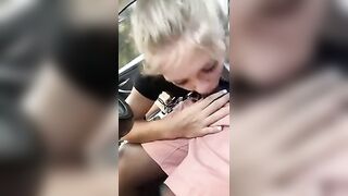 French wife sucking cock in car while he is driving - real public exposure and fuc...